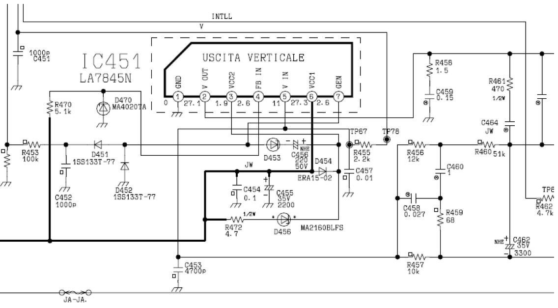 A függőleges végfok IC LA7845N cserélve lett, továbbá C456 220u/50V és C455 2200u/35V, ill. D456 MA2160BLFS zener, amely zárlatos volt, szintén cselélve lett. A zener helyett BZX85C16 16v 1,3W került beépítésre. Tápfesz ellenőrizve (27V). Pár nap múlva a kép felső része összeugrott, redőny szerűen leereszkedett. A D456-os pozícióban lévő zéner ismét elszállt. Beleraktam egy újat, de ismét tönkre ment. Kiiktattam a zénert és rövid időre bekapcsoltam a készüléket nélküle. . A kép jó lett. Akkor most nem tudom mi a szerepe. Lehet, hogy valami védelem, így tartósan nem mertem üzemeltetni. Ha valakinek van ötlete, akkor segítsen.
