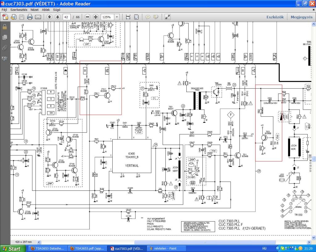 Én inkább a képcsőtől visszafelé indulnék el, a videovégfok Ic. mérésével annak RGB. fesz.g meghajtó oldali részével kezdeném. Oszcilloszkóp nem kell ehhez a hibához, multiméter elegendő lesz. Szakadt ellenállást kiszáradt 1-10mikros elkot keress. Idézet: „Egyébként elő tudom hozni a képet: mégpedig ugy, hogy a scart csatlakozó 19-es lábáról /kb 1,8 volt van rajta FBAS jel/ - az alaplapi RGB csatlakozóra viszem , attól függ melyikre és olyan szinbe jön be. Ha mindháromra ráteszem akkor fekete fehér a kép, csak el van csuszva jobbra a fent emlitett fehér csikkal határolva. Osd nem jön. A vezérlő proci sda 5252 szerintem jó, mert az osd jelet kiadja és csatornát is tudok váltani és hangerőt is. Van egy 5 mHz-es oszcilloszkópom is, ha valaki irányt mutatna hogyan tovább?” Szerintem az a rész megy rendesen. István