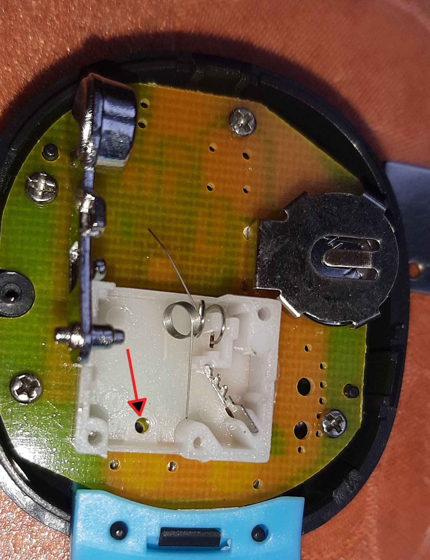 Tovább bontogattam a lépésszámlálót és ezt találtam benne.Nyíllal jelöltem, hogy a kalapács melyik lyukban támaszkodik.