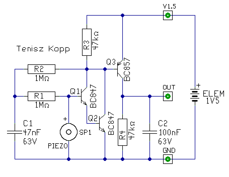 Én egy ilyen Piezo hangszórót próbálnék meg érzékelő gyanánt használni. És hozzá egy ilyen kis egyszerű kapcsolást. Hogy működni fog-e a dolog arról fogalmam sincs, én mindössze kigondoltam a dolgot és megrajzoltam.