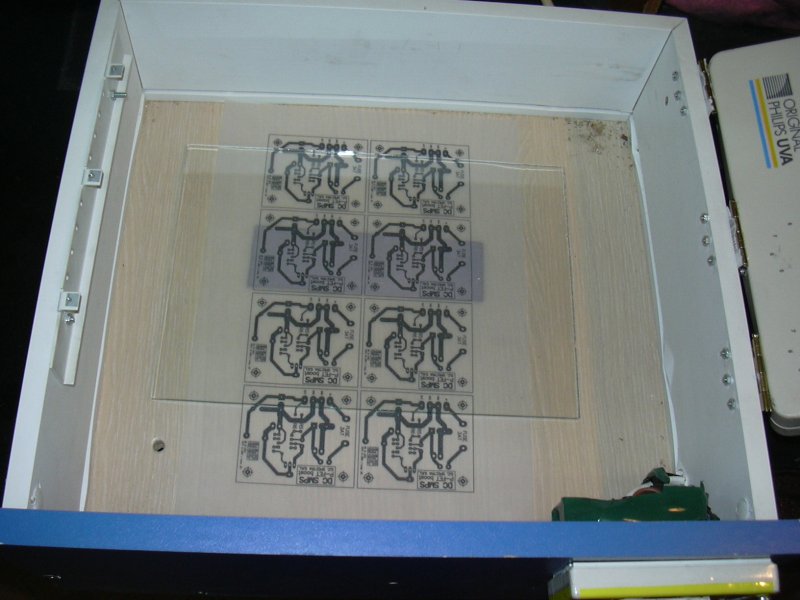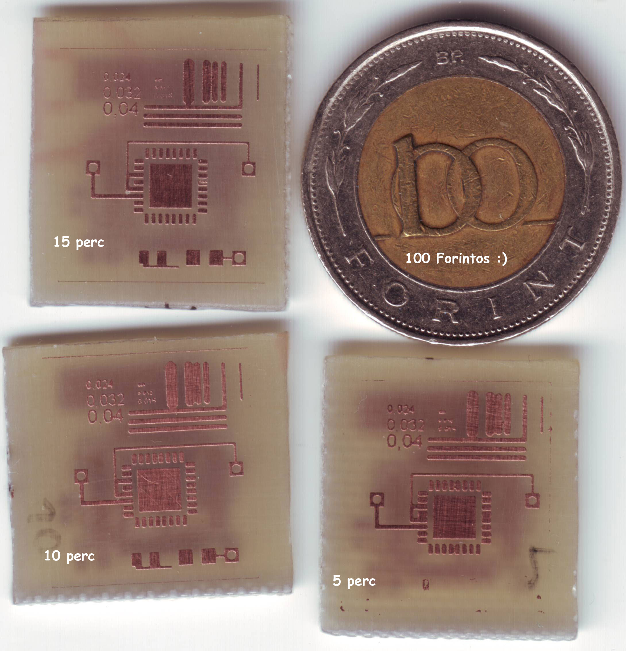Közben a gyakorlat teszi a mestert elv alapján, ma sikerült kitapasztalni miért foltos a positivval lefújt panel... Egyszerű a válasz: NAGYON JÓL le kell takaritani!!! Nekem sikerült konyhai finom csiszoló porral ledörzsölni majd vizzel jól lemosni és egy száraz szöszmentes rongyal lesurólni. Pauszpapirra nyomtatott panelrajzot készitettem és a levilágitási távolság kb 10 cm, idő: 140 másodperc. A száritóis OK, 15 perc alatt meg vannak száritva a panelek. Teszek fel képeket a száritóról meg a levilágitóról, talán másnak segit ötletet meriteni. Jövőheti tervem egy maratókád készitése... Üdv mindenkinek.