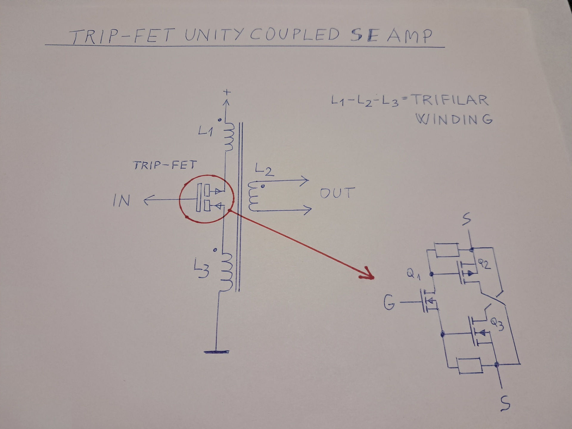 A TRIP-FET unity coupled single ended amplifier trifilar tekercseléses kimenetének az elvi rajzát felteszem.