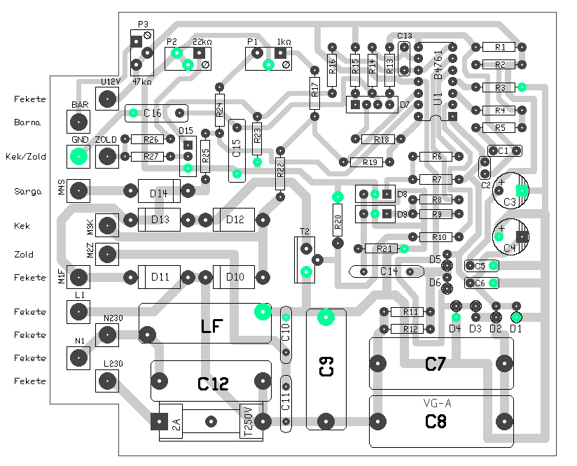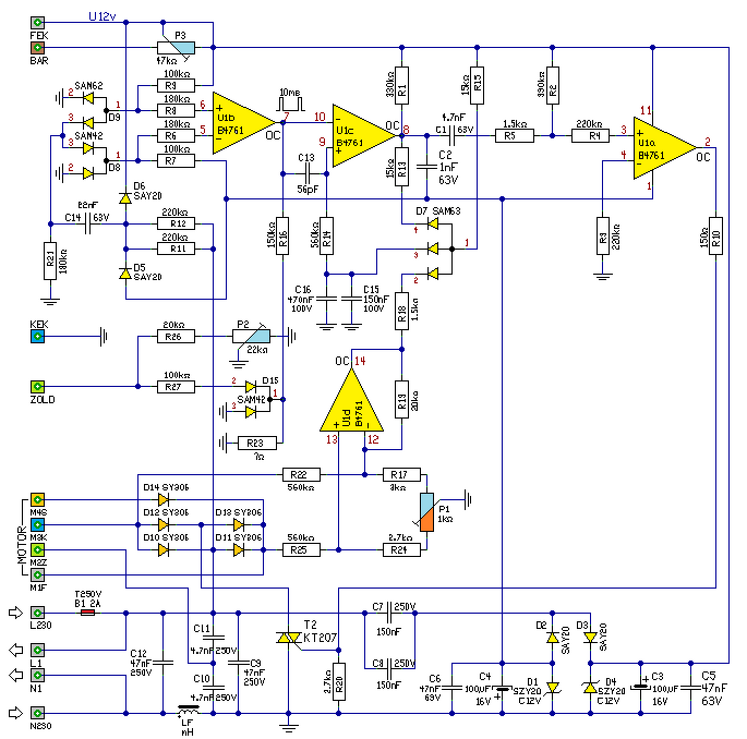 Köszönet a kapcsolási rajzokért. A fenti kapcsolási rajz nagyban segített abban, hogy sikerült megjavítanom egy Veritas Famula 4891 varrógép - életjelet nem mutató - fordulatszabályozó elektronikáját. Javítás után oszcilloszkóppal megnéztem a jellemző pontok feszültség jelalakjait, amit a kapcsolási rajzon feltüntettem. Ezzel próbálok segíteni annak, aki a panel javításába fog bele. Felhívom a figyelmet, hogy a panelen a 230 V-os feszültség fázisa a gyengeáramú részeken is megjelenhet a hálózati dugó helyzetétől függően. Ezért hálózati leválasztó trafót kell alkalmazni mérés közben.