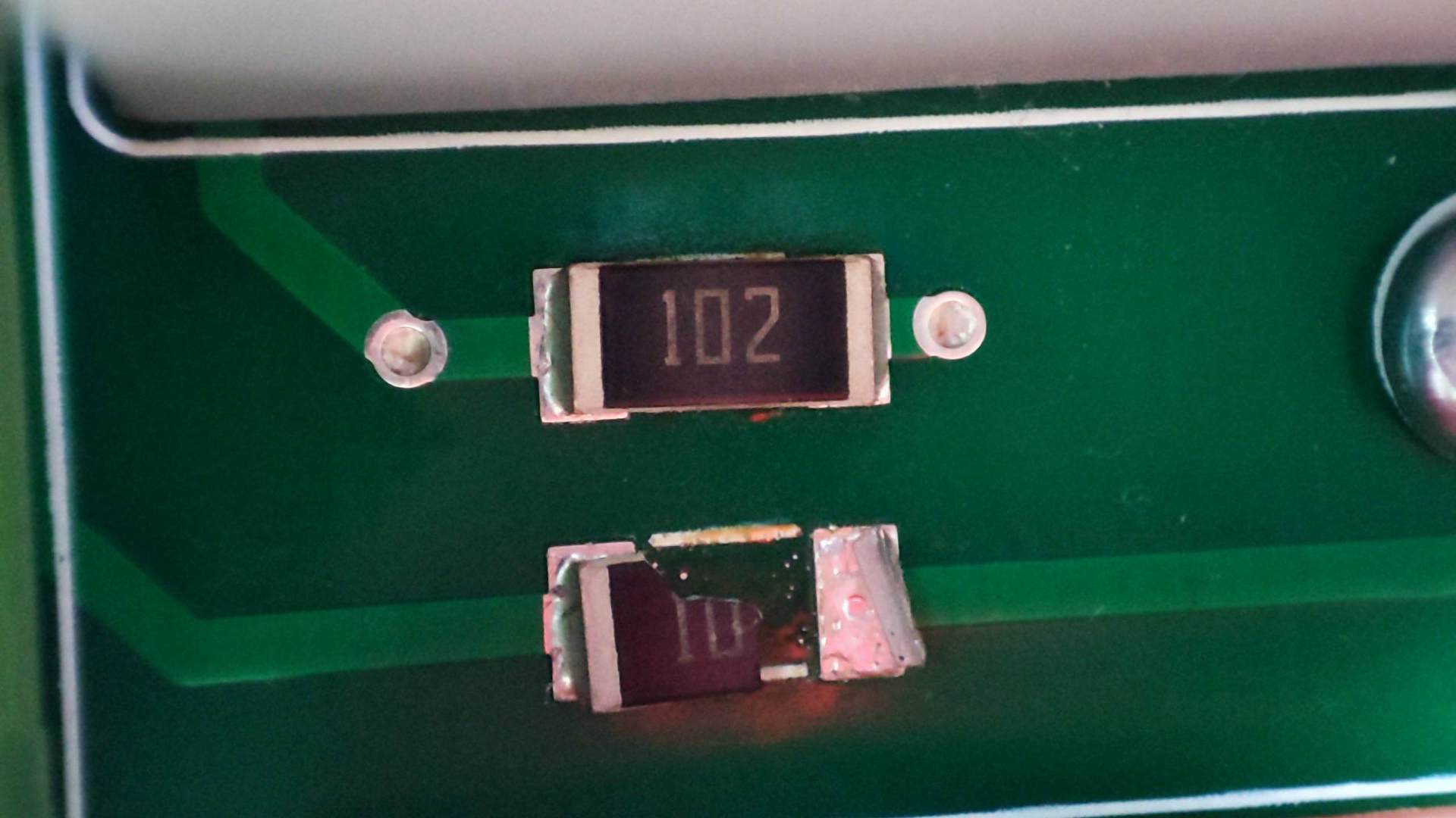 Roll 230 kapunyitó elektronikában a képen látható módon tönkrement egy 102 feliratú smd ellenállás. Kb 6*3 mm a mérete. Azt tudom,hogy 1 Kohm de , milyen teljesítményű lehet? Székesfehérváron nem találtam,így segíthetnétek egy tippel. Esetleg mivel helyettesíthető? A kis huzal ellenállás ,amit adtak azonnal kiégett. A segítséget előre is köszönöm. |