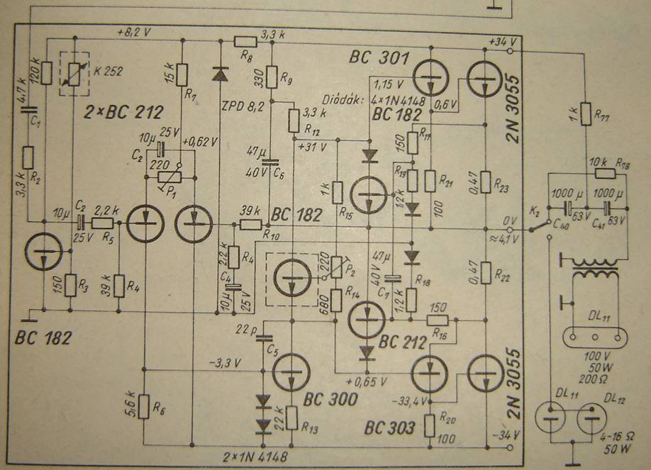 A 31 V rossz helyre van írva, valójában R12 másik (fölső) végén kellene ennyinek lennie! Lehet hogy BC301 zárlatos. Nem csak pipák kellenének, hanem konkrét feszültségértékek "mindenhová", abból lehetne diagnosztizálni. A -3,3 V felirat is hibás, valójában -33 V-nak kell ott lennie.