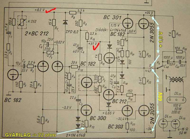 A kimenet és a test között 33,5V az egyenfesz. A BC 300-as tranyo rettentően melegedett és ránéztem az emitterellenálására és 22 ohm volt a panelen gyárilag, miközben a rajzon 22k; vajon melyik lehet a reális? Ja fentebb kifejtettem hogy majdnem az összes tranyót kicseréltem. Valahol olvastam hogy a trafo primer körbe tegyek izzót tesztelésnél : na itt nem világít. Aztán máshol hogy a két egyen tápágba tegyek: na itt először halványan parázslott, demár nem. Aztán innen is eltávolítottam. A rajzon a kipipált feszültség értékek helyesnek bizonyultak mérés alapján is. Várnék ötleteket hogy hogyan haladjak tovább.
