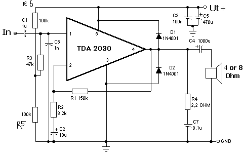Én azt az 1nF-ot kikötném, és a tápfeszültségfelező 100k-sokra raknék 100µF-ot. A becsatoló kondi a kép alapján fordítva van. A többi jó. Ezzel hasonlítsd össze, ez tuti jó:TDA2030