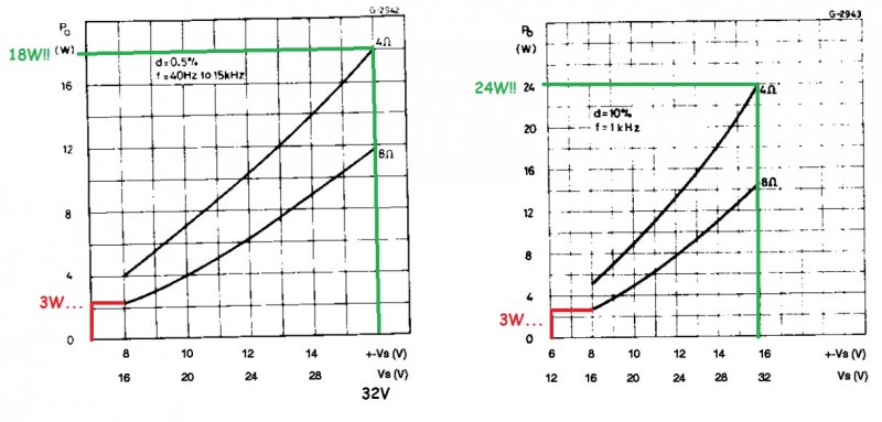 Az idézett kapcsolás tehát 4 ohm-on (itt még nem lép be az áramkorlát) várhatóan 8W körüli teljesítményt fog leadni, 8 ohm-on pedig 4W-ot. A linkelt oldalon olvasható, "több mint 30W" állításnak köze nincs a valósághoz...