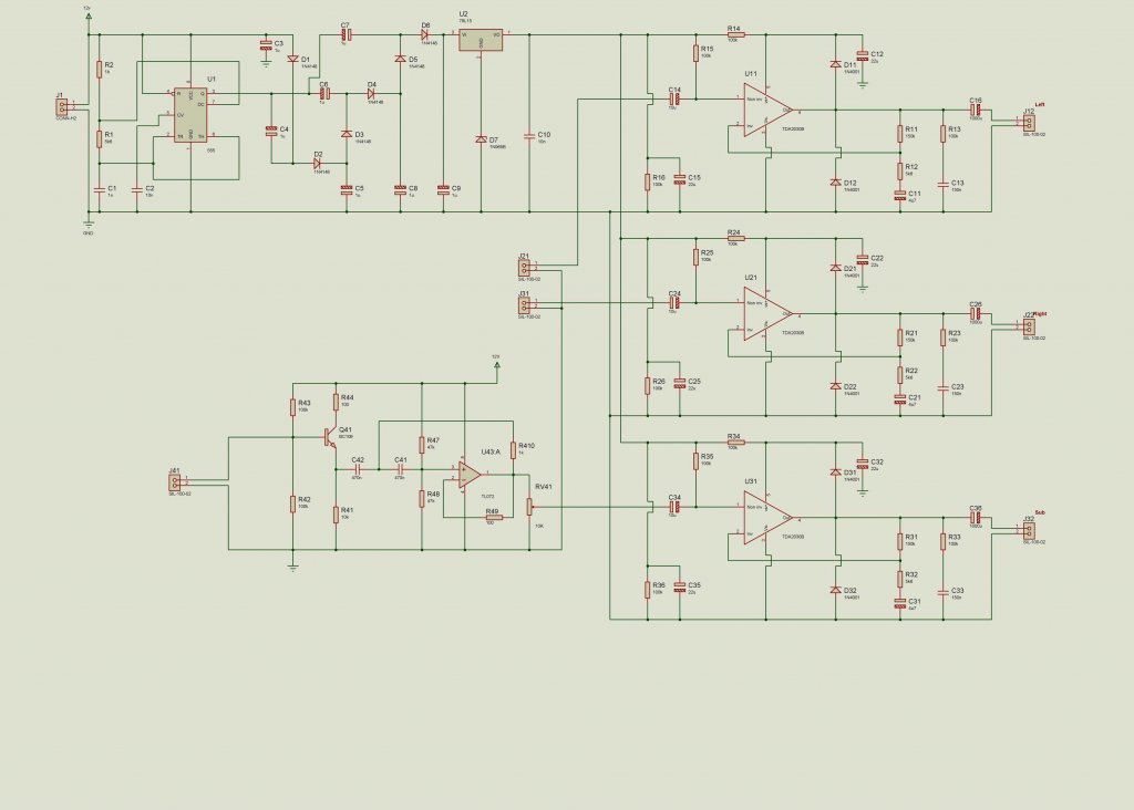 Összeraktam egy "2.1-es" erősítőnek nevezett valamit. Egyenlőre csak rajzon, de nemsoká panelen is összerakom. Az lenne a kérdésem, hogy ahogy összeraktam az úgy működhet? Elméletben: Van egy 12V-os táp, amiből 555 IC-vel és kis trükközéssel 30V-ot varázsolok. Ez a táp látja el mind a 3db TDA2030-as IC-vel épített erősítőtt. A SUB elé raktam egy hangváltó kapcsolást TL078 IC-vel, és ezt vezettem a bemenetre. csatoltam a rajzokat amikből összetettem, plusz egy Proteus 7-el készült DNS fájlt (rajzot) is.