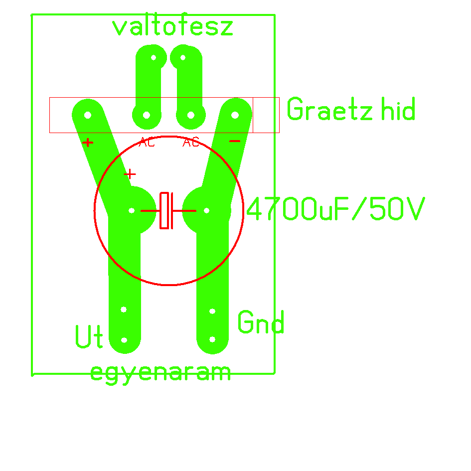 Csináltam gyorsan egy kis tápot, ez a legegyszerübb és ez elég isa TDA-k hoz. Egy nyákra ezt gyorsan fel tudod rajzolni, vagy pedig vegyél furatos próbanyákot és egy vastag rézvezetékkel kösd össze az alkatrészeket. A filet is elküldöm mert az mérethelyes. ezt nyákba ültethető sorkapcsokra terveztem, azzal könnyen lehet dolgozni, Teháta bemenetre eggyet de akkár kettőt is tehetsz,