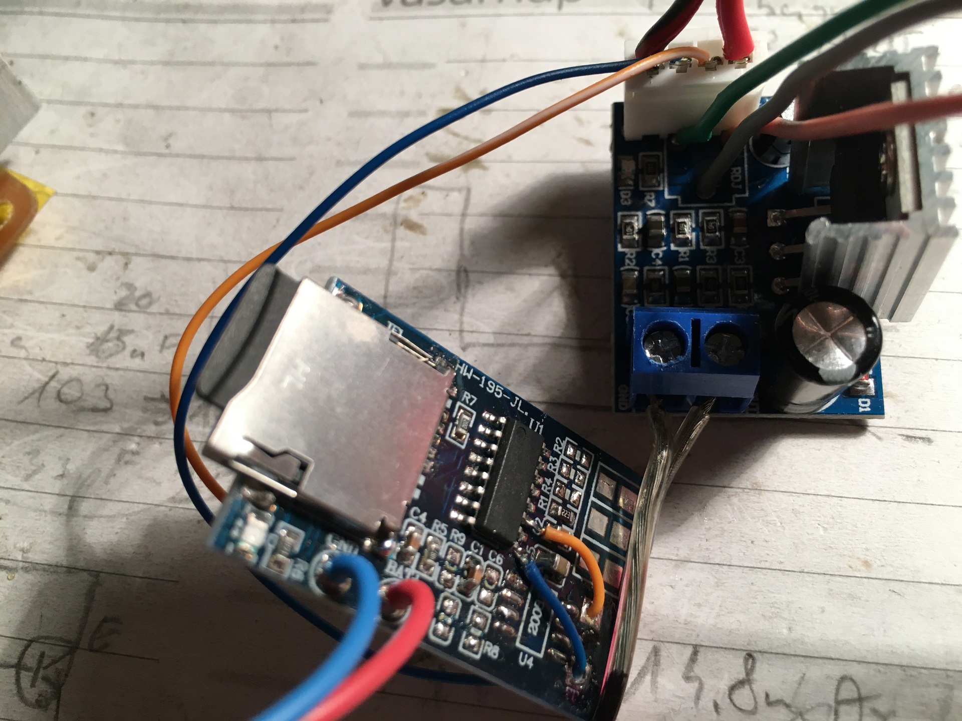 Építettem egy időzítós kapcsolást, ami egy PIC-el vezérelve kapcsol egy PFET-en keresztül 12V-os tápot. A kapcsolt fesz el van ágaztatva. Az erősítőt kapcsolja, aminek a mellékelt rajza van. Illetve egy kínai mp3 lejátszóra 5V-ora korlátozott fesszel stabkockán keresztül és izolált DC-DC konverterrel leválasztva. Viszont a hangszórón az erősítő nagyon zajos. Ennek a csökkentésében vagy megszüntetésében szeretnék segítséget kérni. Csatoltam pár képet a dobozolatlanul összedugott panelekről, azért ilyen káoszos egyenlőre. Itt a vezetékek szigetelésének érintése is erősíti vagy gyengíti a zajt, illetve a kapcsoló FET hűtőbordájának érintésére is jelentősen csökken. Tudnátok segíteni és tanácsot adni? Köszönöm előre is! Üdv: spgabor