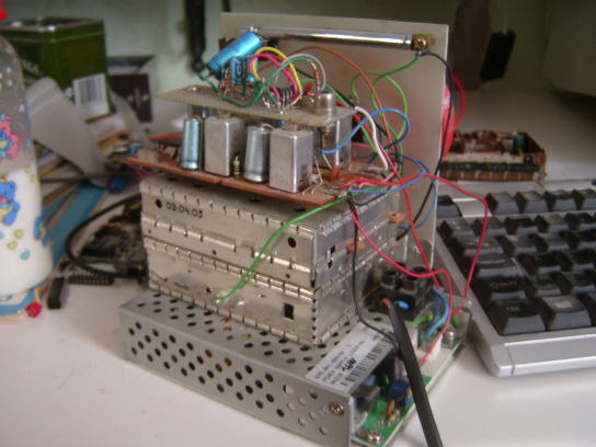 Itt van amúgy a rettenet, ez csak egy sima TV-hang-vevő. Alulról fölfelé: 12V táp, Orion tuner, Orion KF, TBA 120 hang KF+tba810Hang végfok, táp a 30V-nak. A cumi nem nekem kell...De van egy rosz hírem, egy "sima" TV tuner nem veszi a 315Mhz-et. Nekünk kábel tuneres gép kell. Nem néztem még utána de szerintem belefér a tartományba. Megjegyzem az UHF is 470MHz-től kezdődik, mégis fogja a 433-at