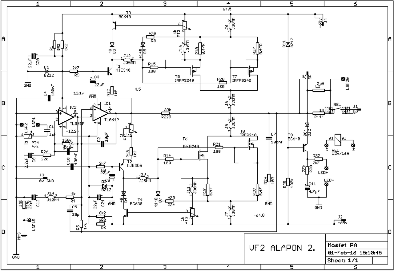 Az alábbi kapcsolást készítettem el IRFP260N fetekkel és +/- 50v -al szeretném üzemeltetni.Eddig csak a zener ellenállásokon módosítottam, kell még valamelyik ellenálláson vagy alkatrészen módosítani mert élesztésnél (10 ohmokon keresztül, a trimmer max állásban) iszonyatosan felforrnak a fetek. A segítséget előre is köszönöm.