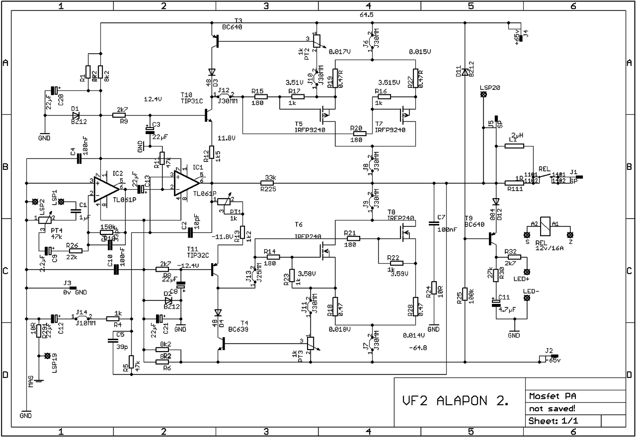 Hogy mi volt a gond ? Hát inkább mivel nem volt gond mert az a kevesebb. A fettekkel (IRFP240/9240) nem volt csak bajom. RELOOP kolléga megírta hogy a tranzisztorokat kell beállítani de ez nem ment simán sőt lehetetlennek bizonyult mert a műveleti erősítők úgy szívattak hogy ha arról leírnám az összes kisérleteimet akkor lehet hogy 5-6 oldalra is szükség lenne. Csak annyit hogy az invertáló bemeneten is és a kimeneten is mindig negatív feszültségeket lehetett mérni amire kihatott ugyan a poti állítgatása de jó nem akart lenni. Tudom hogy elektronikai szemszögből ez lehetetlen de hiába volt mindenféle takarítgatás és IC-ék cserélgetése (többfajta) amíg nem cseréltem foglalatot ! Na ezt hagytam utoljára mert vadi új volt berakva és nem láttam értelmét . Most hogy ki van szerelve méregetem és még nagyobb feszültségen sem találok benne hibát viszont most lehet mindent állítani a jel is szép a kimeneten. Viszont a tranzisztorok soros ellenállásait le kellett kötni mivel a G-S között ott vannak az 1 k Ohmos kisütők. Még nem vagyok benne biztos ez maradhat-e így . A nyugalmi áram állítható de az most még nem az igazi az izzók miatt. Ki kellene szednem őket de még nem merem mert a feszültségeket hasonlítgatom és számolgatom majd ha biztosabb leszek akkor kiveszem őket és megy a valódi tesztelés.