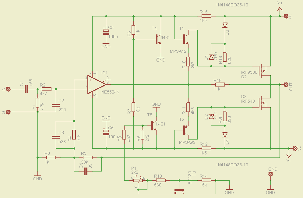 Több lépcsőben jutottam el R6=10k, R10=6k8, P=10k értékekig. Így a nyugalmi áram +-24V-nál 20mA, a poti állítására nem reagál, +-30V-nál pedig 150mA, a poti 10k-s állásánál. A 10ohmos korlátozó ellenállások még bent vannak, ezeken is esik 1,5V. A FET-ek párban vannak, IRF540, 9540, csak a rajzon van eltérés. Még küzdök egy kicsit, mert 2X24V-os toroid trafóm van hozzá, és nem mértem ugyan, de úgy sejtem, hogy üresjáratban 35V körül lesz a tápfeszültség.