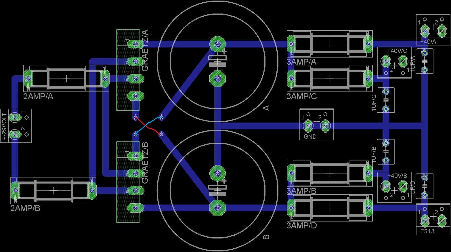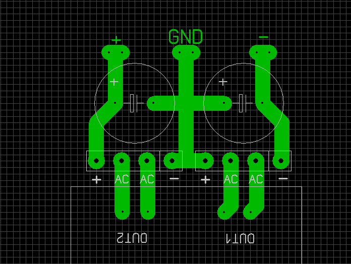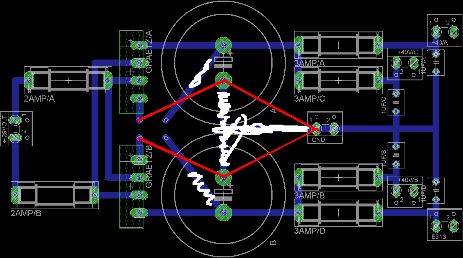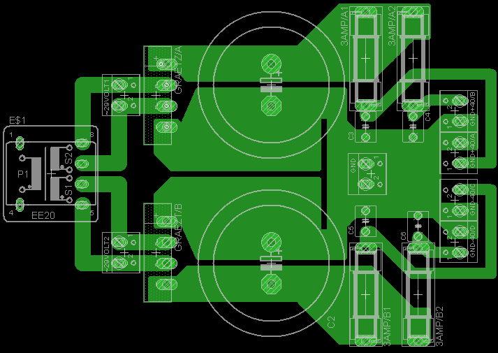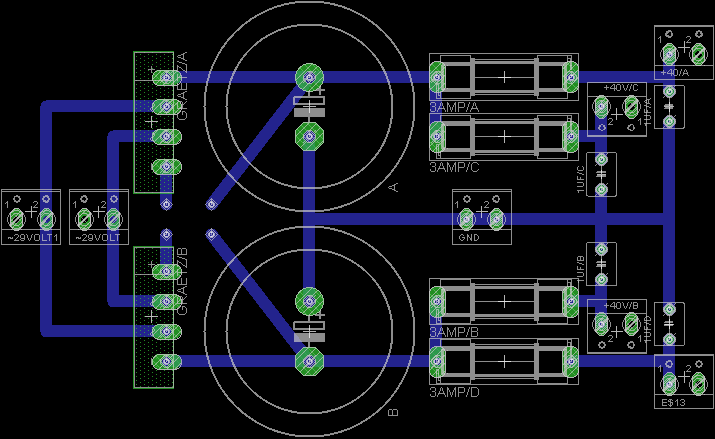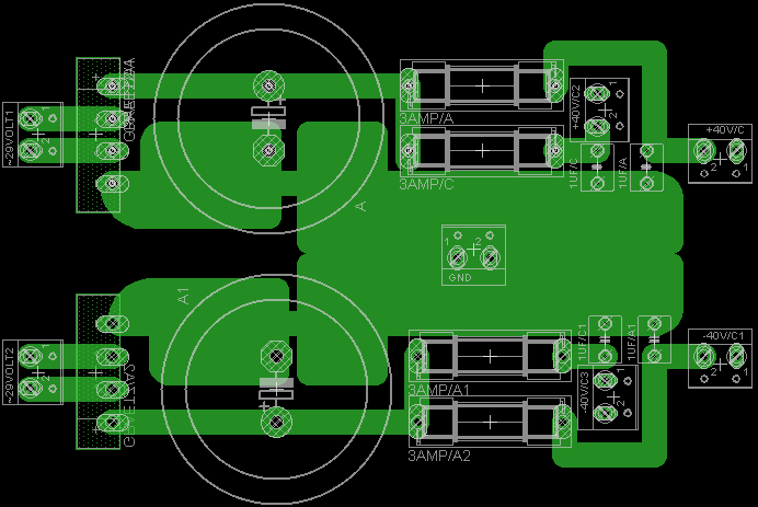 Ügyelni kell a graetz és az elkokat összekötő fólia vezetésére, mert könnyen brumm keletkezhet, ezért kell különválasztani a GND szakaszát az elkok pontjainál.