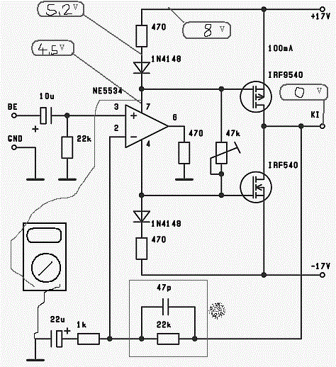 Ennek a rajznak így nem lehet értelmet tulajdonítani. A felső vezeték egyik végén +17V van, a másik végén meg 8V???