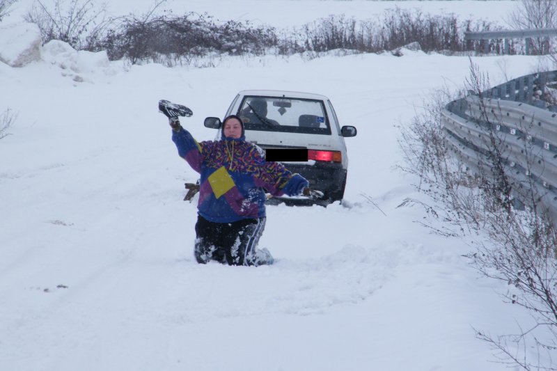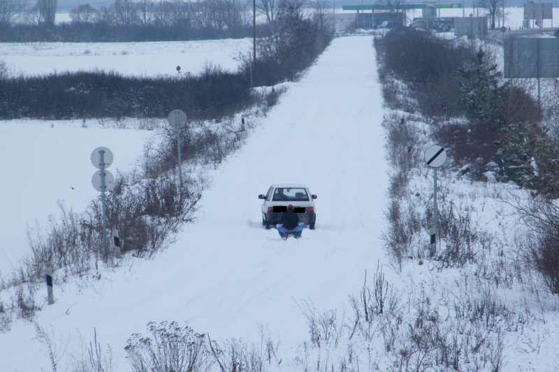 Az alföldön nincs lejtő hogy szánkózni lehessen, de van kocsi, havas bekötőút és vontatókötél. Az asszony hozta a formáját, még a cipőt is elhagyta.