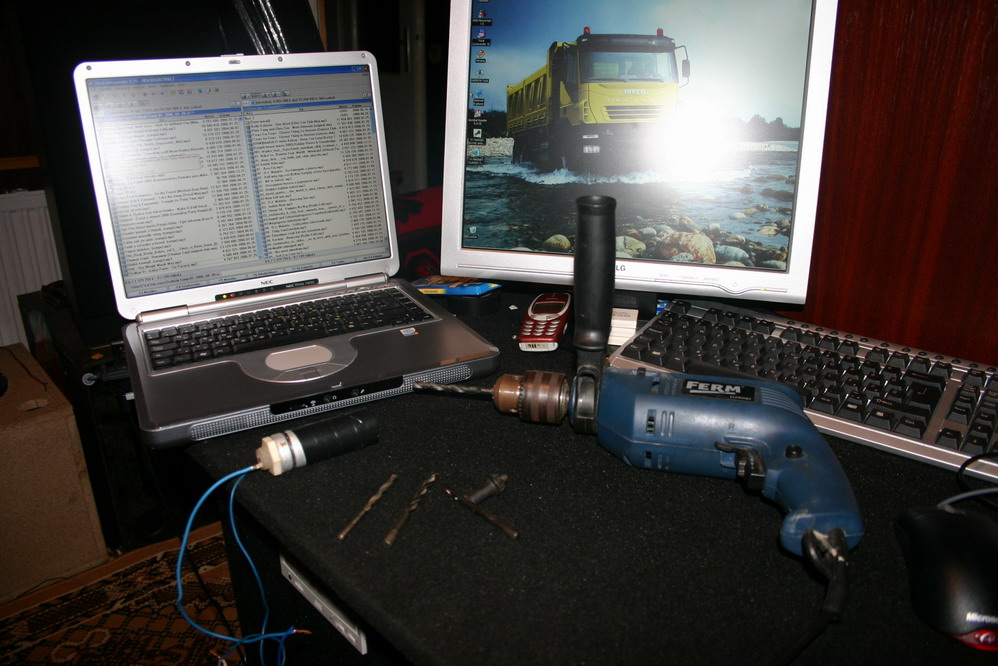 A fúró azért van ott, hogy jukat fúrhasson a laptopba, hogy aztán beleszerelhesse azt az orosz kondit, hogy fel pufferelje a memóriát! A másik gép meg csak azért van ott, hogy feszenghessen, hogy: tyhűű nekem 2 gépem van...!