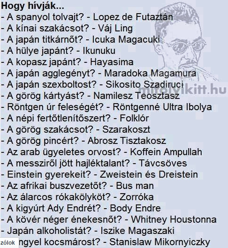 "Nem, uram, nem tudom. De, ha már a kérdéseknél tartunk, Ön észrevette-e, hogy én egy angol kocsiban ülök és a feleségem vezet, aki a túloldalon ül...?"