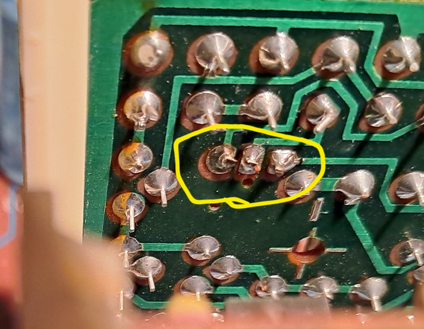De aztán sikerült reprodukálni. Elkezdtem egy műanyag pálcával nyomkodni az alkatrészeket (közben az emitter ellenállásra ráforrasztottam két banándugós kábelt, hogy folyamatosan lássam a változást), és a T16-hoz érve vált bizonytalanná a működése. Alaposabban megnézve nem is véletlenül. Annak viszont a forrasztása törött, a bal szélső láb a keretezett részen belül. Újraforrasztva egyelőre jó, de akkor már lehet alaposabban átnézem mindkét modult. A hozzászólás módosítva: Márc 22, 2023