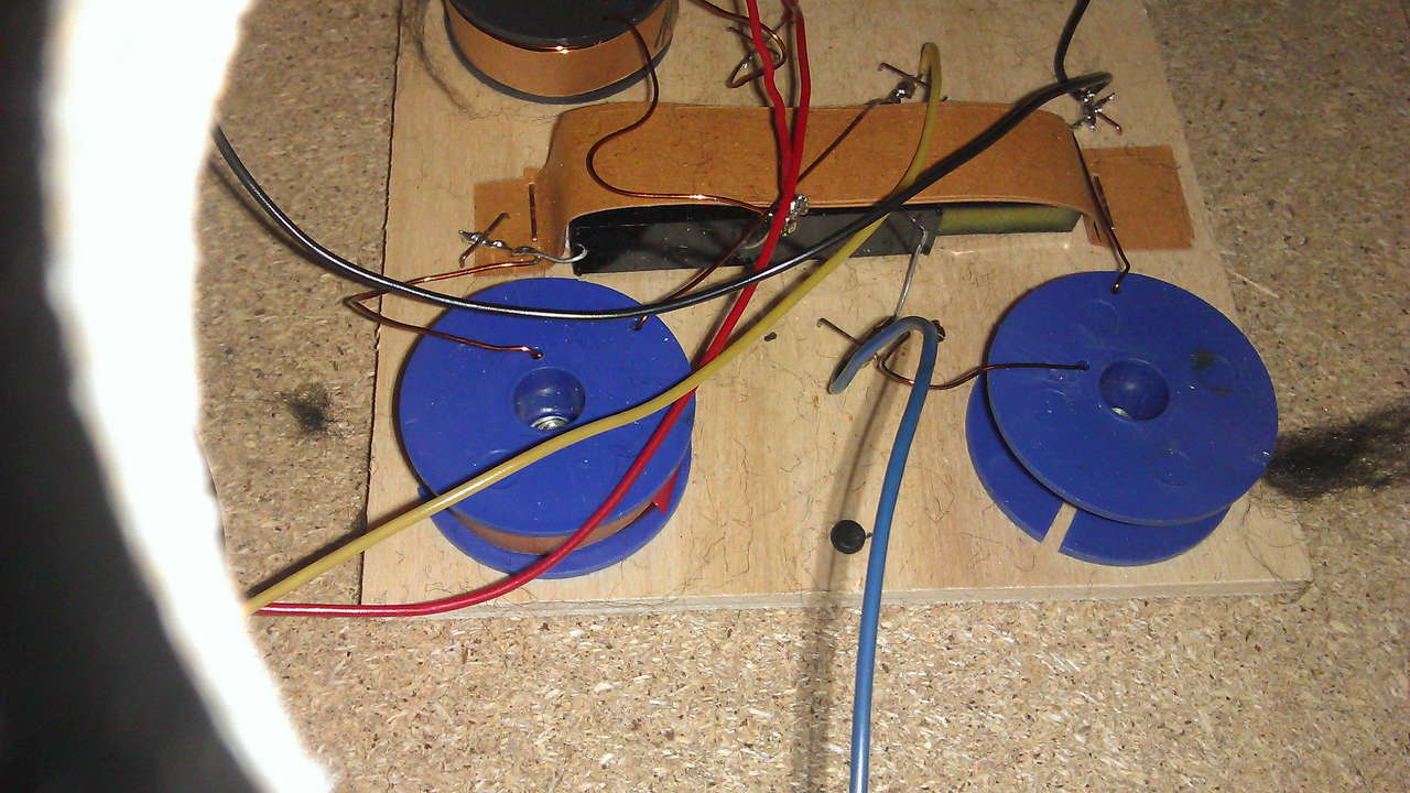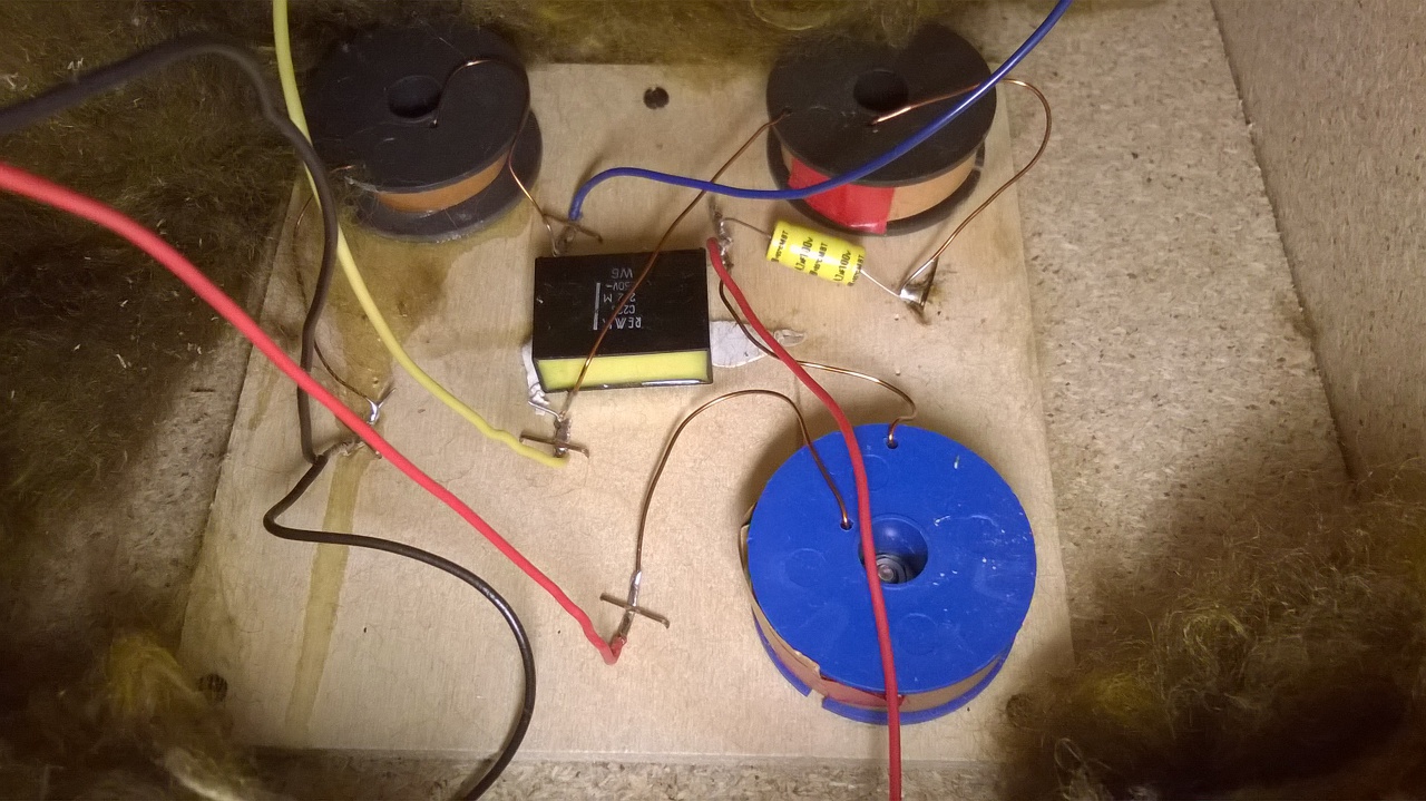 Ím itt egy kép. A kék vezeték a magashoz megy és olyan ahogy a rajzon is van , a sárga az a közép. A melegpontról egy 4.7µF majd a tekercs és a közp melegpontja sorban. Ez így nem hiszem , hogy megfelelő. Nem a kondi és a tekercs közös pontjáról kéne a középnek lemennie és a tekercsnek a földön végezni? Az úgy 12dB-s váltás , ezt a megoldást viszont nem tartom valószínűnek.