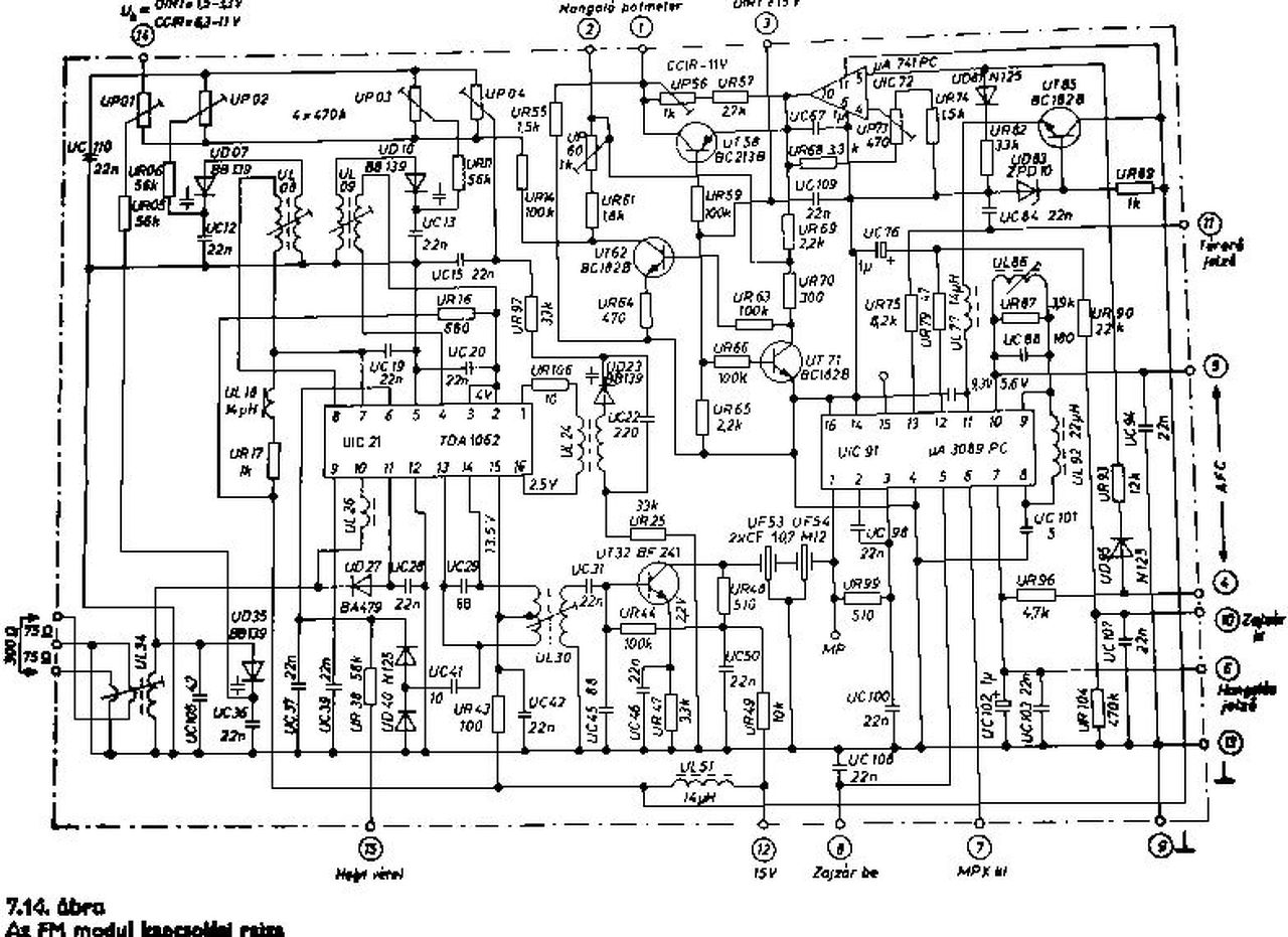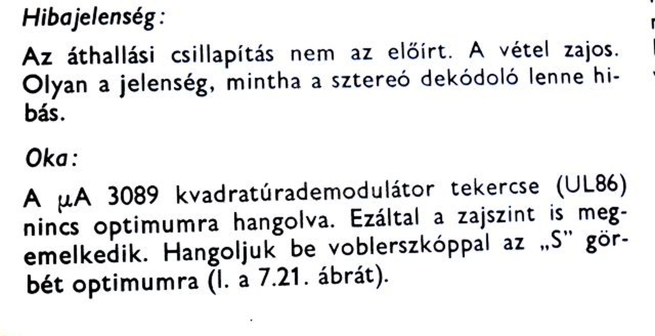Az S-görbe (demodulátor kör, majd a kollégák kisegítenek, melyik tekercs az) tekercsének alján van egy kerámia csőkondenzátor. Több esetben találkoztam ezzel a hibával. Sajnos, kb. 20 évvel ezelőtt volt, értékére nem emlékszem, de hátha valaki tudja, milyen értékű kondi kell oda. A kondi hibájakor a jelenség a következő volt: van rendesen FM zaj adó nélküli helyen, adóra hangolva térerő is van rendesen, de pont hangolásközép állásban néma lesz a készülék, nincs audió jel. Ettől félrehangolva, akár jobbra, akár balra, egyre erősebb a hang, de torz, AFC rossz helyre húz.
