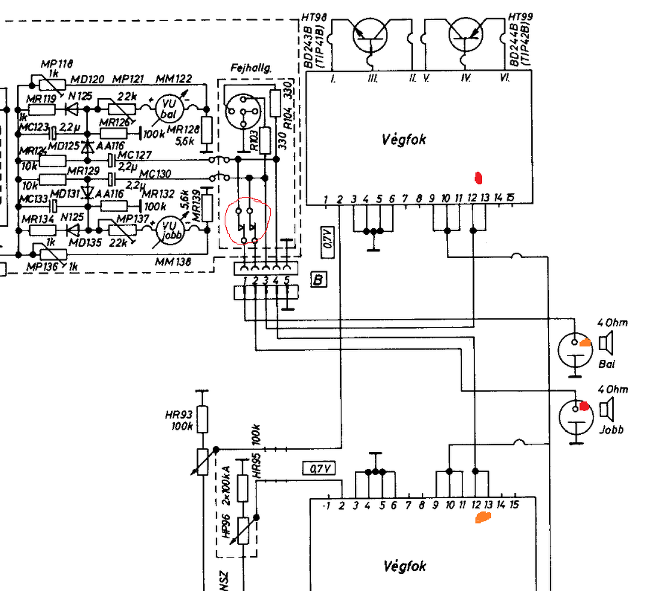 A végfokok kimenete a 12-13 lábon át az alsó nyákon a fejhallgató csatlakozóig megy, majd onnan vissza, a kimenethez. Vagy le van húzódva a csatlakozó (az, ami a fejhallgató aljzatról megy az alaplapra-de nem hiszem, mert akkor a műszer sem mutatna), vagy hibás a fejhallgató csatlakozó, esetleg nem húztad ki a fejhallgatót. Ha van műszered: mérd meg a folytonosságot a kimeneti csatlakozóban a kerek luk és a végfok 12-es lába között. jobb-jobb, bal-bal. Keresztbe nem jó a folytonosság Valószínűleg nem lesz, a fejhallgató csatlakozó vagy a nyák hibája miatt.Ha nem kell fejhallgató, akkor forraszd össze az 1-4 és 2-3 lábakat fajhallgató csatlakozóján (ami az alsó nyákra megy), de dugd vissza, mert onnan megy a műszer is, és nézd meg, hogy úgy van-e kimenet. Ha ez sem segít, akkor a nyák szakadt, köss kábelt közvetlenül a 12-es lábról a kimeneti csatlakozóra. Az oldalakat nehogy összecseréld kötögetésnél, mert ha mégis elkezd érintkezni az eredeti bekötés, akkor zárlatot okoz. Ha nincs kimenet így se, akkor mérd meg, hogy a végfokon biztos van-e jel (vagy egy próbahangszóró a 12-es láb és 3-as láb közé) A leírásod alapján kell lennie, mert a végfokról megy a műszer. Aztán lehet, hogy nem lesz, akkor kell egyéb hibát keresni (meg azt, hogy akkor hogyhogy kilengett a műszer) A hozzászólás módosítva: Nov 7, 2017