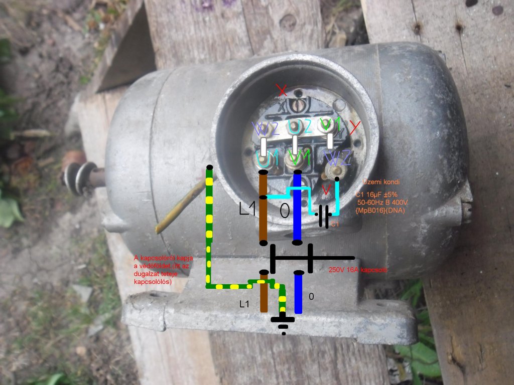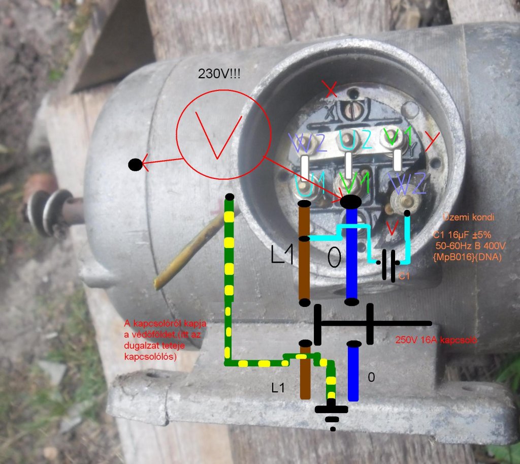 A kérdésem a következő lenne. A motor 380V/220V (Y/Delta) 50Hz csekély 350W 220-as részét akarnám használni 1 fázisról,kondival létrehozott fáziseltolással(90') A motort ugye összekapcsolva deltába W2-U1 U2-V1 V2-W1Képen jelöltem U1-re fázis V1 -null W1-üzemi kondi-párhuzamosan a fázisal(vagy Nullával kötve,forgásirány váltásból) Ennek így jónak kellene lennie tudtomal!!! A motor be is indul felpörög veszi a lapot (TERHELETLENÜL)Ha nagyobb terhelés végett nem indulna+még egy segédkondi az üzemivel párhuzamba amit nyomogomb,vagy indítórelé kapcsolhatna...(nemlessz sose terhelésen használva)-ezért ráse kötöttem Az üzemi kondi értéke 16µF 400V(2 kivezetéses Mp kondi,műanyag burkolatban) Kérdésem: Mivan ha ez a Kondi elszál?(pl zárlatos lesz és nincs letestelve,nem fémházas) Fázisceruzával mérve a villanymotor házán működés közben miért jelez?(igaz csak a műhelyben ahol a védőföld mint kiderült szar) átvittem másik helységbe ahol jó ott természtesen nem, jelez. Világosítson fel valaki erről hogy ha a védőföld egy adott konektorba szar,akkor jelez nekem a fázis a villanymotoron,miért? Az adott helységben ahol a villanymotoron jelzett a fáziskereső megkerestem a konektorba a fázist. Kimértem multi.Mét.-el a Fázis-0 között 230V 0-Védőföld=0V Fázis-Föld között=21-30V...ingadozva csekély 30V váltóáramot csak... Ugye nullázott földelés van Kimértem ott is ahol a villanymotorra nem jelzett ott a konnektorban: Fázis-0=230V 0-Védőföld=0 Fázis-Védőföld=230V Tudtoaml(nem vagyok villanyszerelő) de a Fázis-Föld között is 230V-nak kéne lennie nem 20-30V között(ugye nullázott földelés) 0-nál <üzemi fezsültség De mivel nullázott földelés A bejövő nullavezetőhöz kötnek egy előírás szerint készült földelést, amit az épület megfelelő környezetében kell elkészíteni. Ezzel elkészül a NEFH, azaz Nullavezetővel Egyesített Földelő Hálózat. Ettől a pillanattól a nullát nem nullának, hanem PEN vezetőnek hívják, azaz az N és a PE együtt fut. Ez a vezeték a kulcsa a biztonságnak és az áramellátásnak is, nem lehet toldani, nem lehet akárhová és akárhogy vezetni! Ez az épület főelosztójában kettéválik: A PE megy egyenesen (zöldsárga, a konnektorban a védővezető), és az N kiválik belőle és nullavezetőként (kék) megy tovább. Azaz a "földelés"-nek nevezett kézzel is megérinthető védővezető és a nullavezető UGYANODA csatlakozik. A kettő között az a különbség, hogy a nullavezető üzemszerűen vezet áramot, a védővezető pedig csak akkor, ha valami hiba van!