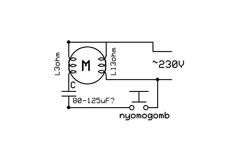 Ez a motor át lett tekercselve 1 fázisúra, 4 kivezetése van. Az egyik tekercsnél 11ohm-ot mértem (az olvasottak alapján ez lessz a főfázis tekercse) a másikra 1.6ohm-ot mértem (gondolom ő lessz a segédfázis) Van hozzá egy 100-125µF-os 320v ac-s kondi. Ez eredetileg egy esztergát hajtott. Bekötöttem a főfázisra a 230V-ot a segédfázisra pedig sorba a kondit, de nem akar elindulni csak búg.