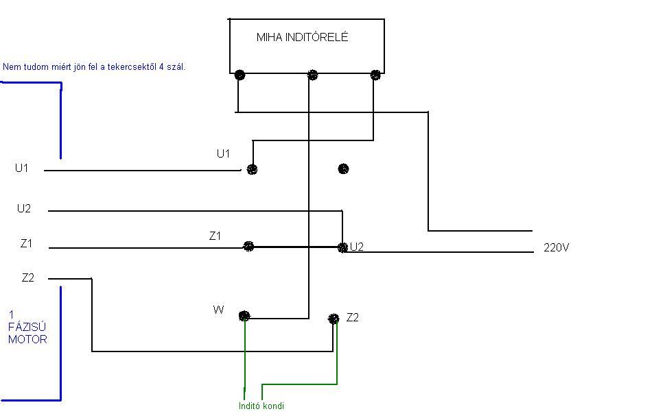 Rakd fel a kapocslécre az átkötéseket (vastag fekete vonalak), végy egy rendes fekete indítókondenzátort meg egy nyomógombot. A rajzon indítórelés megoldás látható, de ez ne zavarjon meg, mert a relé érintkezőinek helyére kell a nyomógombot bekötni.