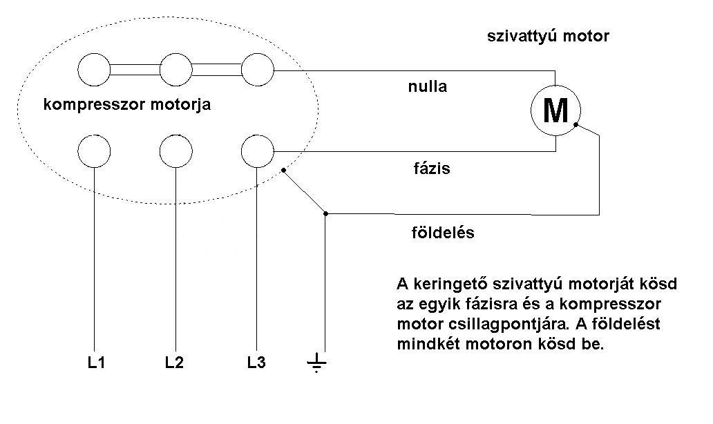 Úgy nem szabályos, sőt veszélyes! Gondolom nincs nulla, csak három fázis és a földelés (négyeres kábel)? Akkor inkább a motorból vidd az áramot a szivattyúnak: a fázist az egyik fázisra, a nullát a háromfázisú motor csillagpontjára(!) a földelést meg értelemszerűen a földelésre. Így szabályos. Persze így csak akkor lehet, ha a kompresszor motorja csillagba van kötve.