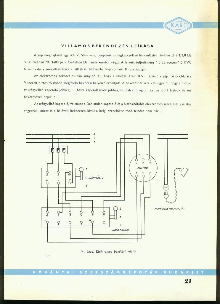 A másik érdekes dolog a munkalámpa bekötése, ami látszólag két fázis közé kerül, ami nyilván képtelenség. Ide 400V/24V leválasztó biztonsági transzformátor kell, ami talán benne is van a gépben. Lehet, hogy ezt csak egy illusztrációnak szánták (bár a szöveg ennek ellentmond).