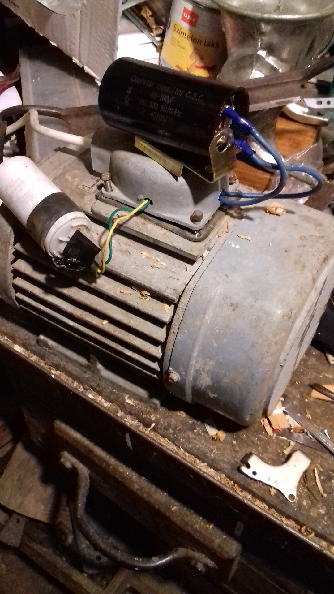 Van egy villanymotorom amire vettek egy indító kondenzátort. Volt már rajta egy kisebb szerintem üzemi kondenzátor a teljesítménye miatt gondolom. Elindítottam üresen, ment szépen, majd 2 perc múlva az indítókondi elfüstölt. Fekete színű az indítókondi fehér színű az üzemi kondi. A képen balról jobbra haladva kapocsléccel össze van kötve U1-W2, V1-U2, W1-V2. Bejövő tápkábel barna be van kötve a U1-re, a kék kábel a W1-re. Indító kondi rá lett kötve U1-W1-re. Üzemi kondi rá lett kötve W2-V2-re (ez ott volt eredetileg). A motor egy IMI Z586-os, 750 W, 1380 fordulat/perc. 220 W-ra van bekötve. Mi lehet a gond? Ki kellene vennem vagy átkötnöm az üzemi kondit? Húsdarálót szeretnék hajtani róla, nem hosszú komoly üzemre lesz szükség, hanem néha 20-40 kg hús darálása egy 22-es Porkerten. Köszönöm!