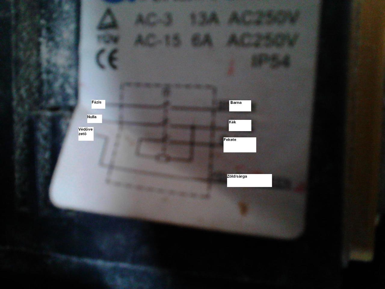 Értem!De ezen a felső piros és az alattalevő kék a fázis és N.Az alatta lévő fekete a kondi egyik ága.A másik a kékre volt kötve.Na és ez alatt van egy fehér ami nem tudom hogy mit szolgál.A nyomogomb dobozán van egy rajz.Kicsit rossz a fotó,de a jobboldali alsó felirat a fehér.