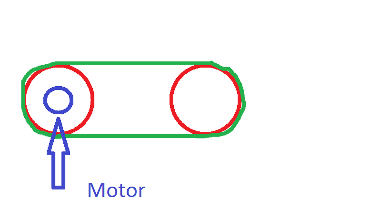 Van egy elméleti kérdésem, egy villanymotor fordulatszáma 1700, tengelyének átmérője 25 mm. A lenti Móricka rajzon az elképzelés, miszerint a villanymotorral szeretnék hajtatni egy dobot, ami egy szalaggal kapcsolódik a másikhoz. Igazából ez egy szalagcsiszoló lenne. A kérdésem az, mekkora dob kellene erre a 25-ös tengelyre ahhoz, hogy 2200 körüli fordulatszámon forogjon a szalag? Érdekelne a számítás menete, hogyan lehet ezt kiszámítani?