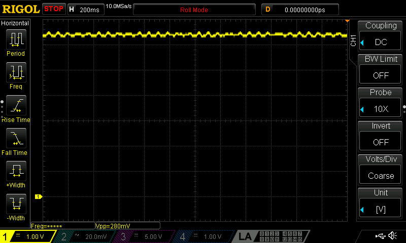 Ma még játszottam vele. Ettől stabilabb fordulatot nem tudok elérni, a nagyobb szűréssel még nagyobbak a kilengések, kevesebb szűrőkondenzátorral (kb. 4 µF környékén) pedig a vezérlés átvált PWM üzemre, a motor rángatózva jár, különösen kis fordulaton.