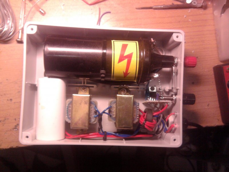 Jól értelmezted,de csak hasonló.Egyébként máshova is lehetne,lehet tenni a szikraközt,én ezt a helyet találtam a legjobbnak számomra.Szikraköz nélkül nem próbálok ki egy pásztort sem,ha nincs véletlen bent,rajt,akkor teszek rá,mert egyszer már megjártam.Azért írtam az akár 5cm hosszú ívet,mert még a kezdetekben próbáltam egy készüléket (kísérlet) szikraköz nélkül,sajnos egy DVM ráment,annak az egyik vezetékére húzott át,közel volt a nagyfeszhez,a másik vezetéke,mért is ne,a testre volt kapcsolva,ennyi a történet.