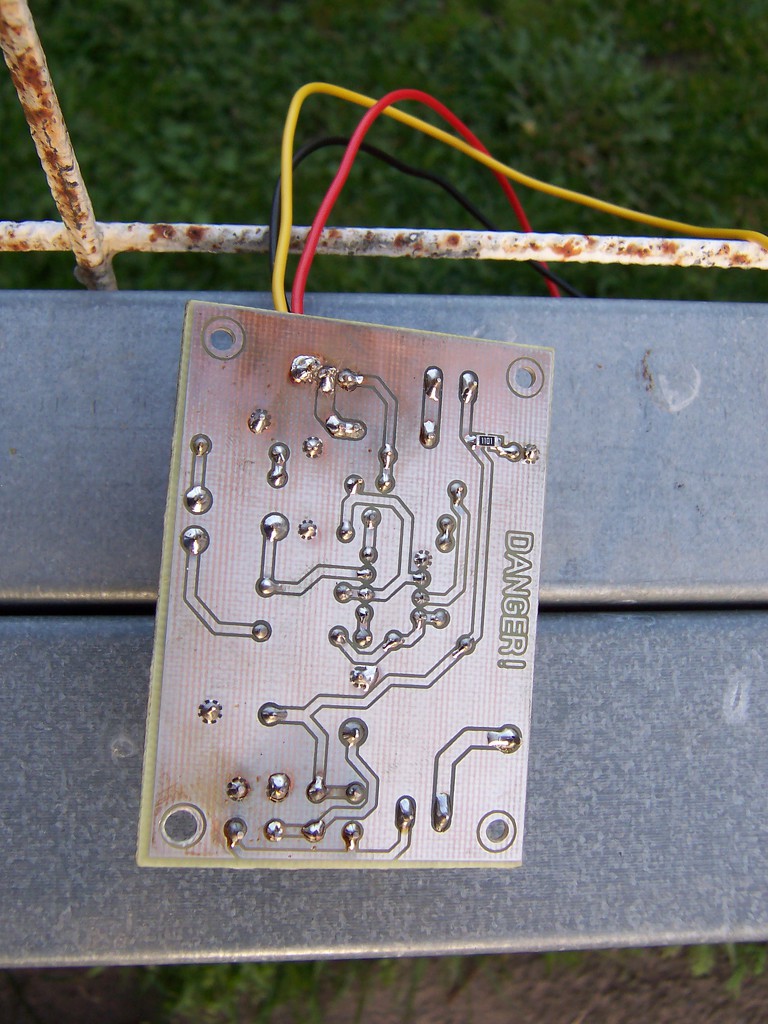Van egy, a képen látható villanypásztor elektronikám. A vezetékekre menne a FET. Eredetileg SUB75N06 volt benne, két napig ment, aztán tönkre ment. Látszik a forrasztási oldalon, hogy mennyire megmelegedett, és kinyomta a panelen lévő biztit is. Az eredeti FET helyett IRF3205 öst raktam bele. Azért van a vezeték, mert hűtőbordára szerettem volna szerelni. Az új FET berakását, üzembehelyezését követően, kb 3-4 mp. ig adta a szikrát, aztán meghalt, és a FET tűz forró lett. Feláldoztam még egyet, az 555 öst is kicseréltem. Trafó nélküli járatással semmi gond, semmi melegedés. A trafót fokozatosan próbálgattam ráadni, (1) de a halál meg ismétlődött. Nem szeretnék további 400Ft os FET et el pocsékolni. Ezér raktam fel az előbbi kérdést trafó ügyben. Kérlek benneteket, ha valami ötlet. Három trafóm van, mind a háromon ugyan azokat az értékeket mérem. Mind rossz lenne. A másik, - nem is nagyon tudom hol mit, milyen értéket mérjek.