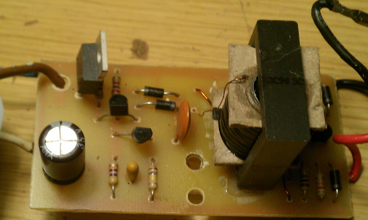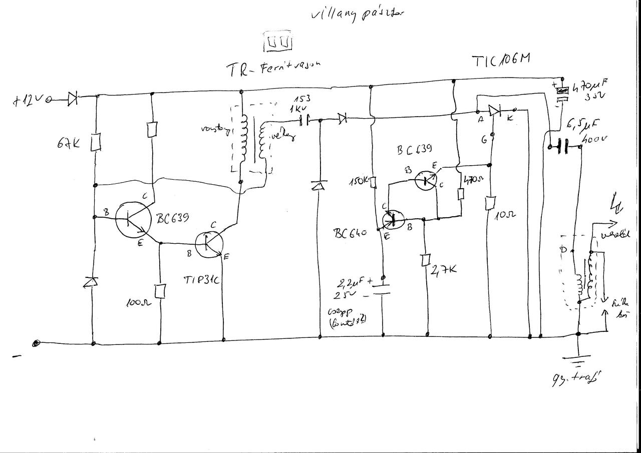 Üdvözlet! Az alábbi villanypásztor rajz talán ismerős valakinek, esetleg megépítette. Működő, nagyon ütős készülékről rajzoltam. Sajnos a TIP 31 tranyónál lévő trafó adatait (menetszám, huzalátmérő) nem ismerem. A tekercsek kb.1,5mm2 -es M ferritvason vannak. A képen a kérdéses trafó van. (A 6,5 µF/400V kondi és az autó gyújtótrafó nincs lefényképezve.)