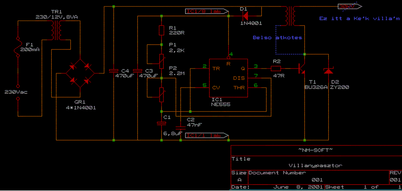 Ezta kpcsolási rajzot valósitottam meg,tőltőttem le mellé nyák rajzot beépitettem mindent ami kell. A ledetszépen villogtatja de a trafót nem hajtja meg. azt vettem észre hogya kimeneten mnd két póluson pozitiv feszültséget ad. Ha tud valaki segiteni azt megkőszőnőm!BERnadó is ezt tőltőtte le a norbimgan elektro honlapjáról. Küldők képeket segitségül. Mindenészrevételt és tanácsot előre is kőszőnők!