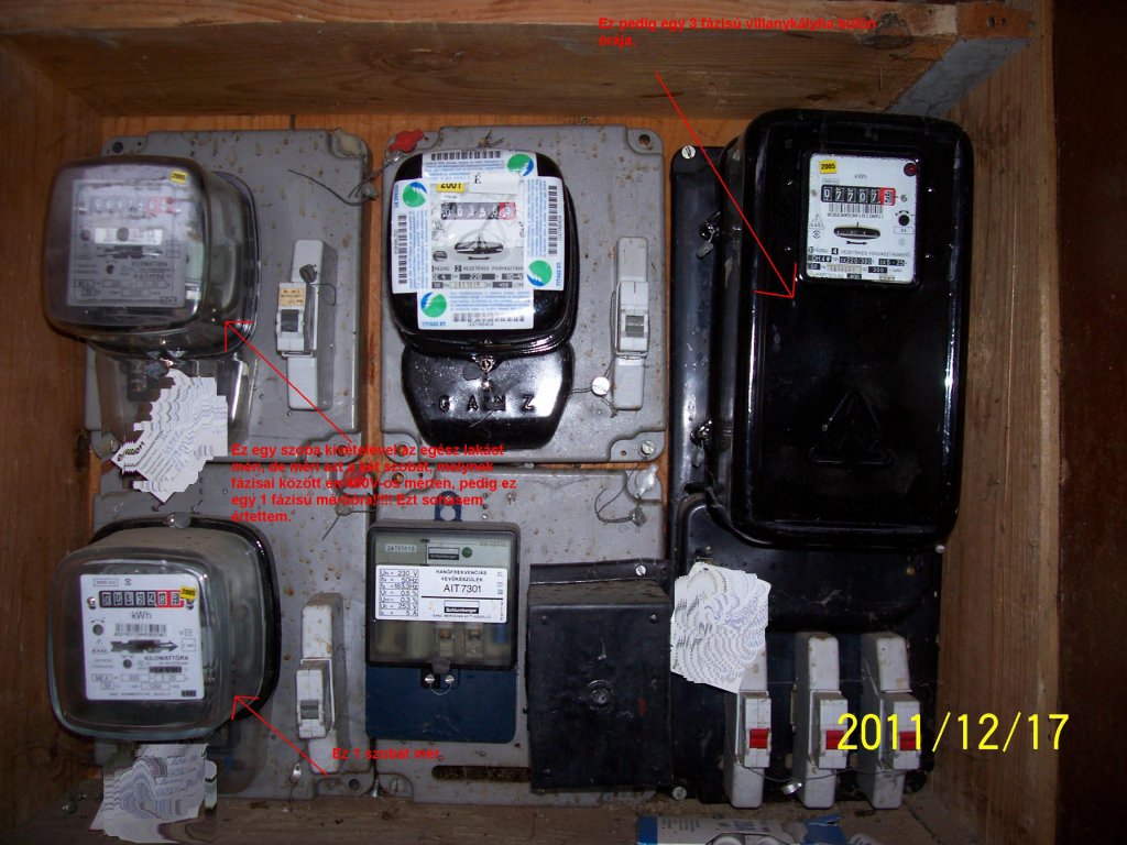 Itt vannak a képek. Egy szolgálati lakásról beszélünk, és nem az egész házban lakunk. Ezért azon a részen, ahol mi lakunk, külön szereltek fogyasztásmérőt. A másik 2 szobába pedig megint csak külön. És van egy 3 fázisú villanykályha egy külön órán. Üdv! Balázs