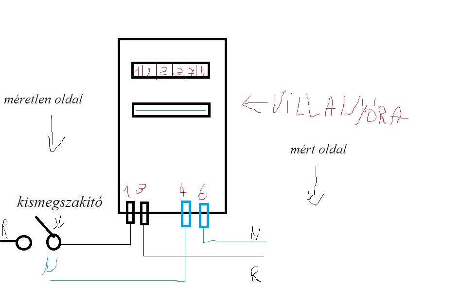 Nagyon egyszerű. A bekötésnél a sorkapcsokat balról jobbra haladva kell értelmezni. Azaz a bejövő fázist kösd az 1-es lábra, az elmenő fázist a 3-as lábról vedd le. A bemenő nullát a 4-es lábra kösd és a nullát a 6-os lábról vedd le. Valahogy így. A kismegszakítót a fázisra kösd.