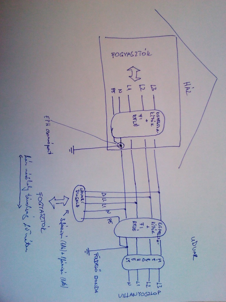 Az alábbi kérdéssel fordulnék hozzátok: Teljes házfelújítás előtt állok, új mérőhelyet is kellett létesítenem. A mérőhely az udvaron található a háztól kb. 25 méterre. A mérőhelynél szeretnék egy 230V-os dugaljat, valamint egy 400V-osat is kialakítani. A mérőhelytől a hálózat 4x50mm2-es földkábellel van bekötve. A hálózat kialakításáról mellékelnék egy skiccet. A kérdésem az lenne, hogy okozhat-e problémát, ha két helyen van földelve a nullvezető (a PEN vezető két helyen van szétválasztva, azonban közösítve nincs). Földeléssel kapcsolatban is lenne kérdésem: A földszondát (3méteres) hol célszerű elhelyezni? Műhelyben (nagy a belmagasság, szóval simál elfér a 3 méter állítva) is leverhetem a fal tövében (előtte alapot átfúrva), vagy kívülről a ház tövében, ahol az eső áztatja a talajt a kisebb ellenállás érdekében? Előre is köszönöm a válaszokat.