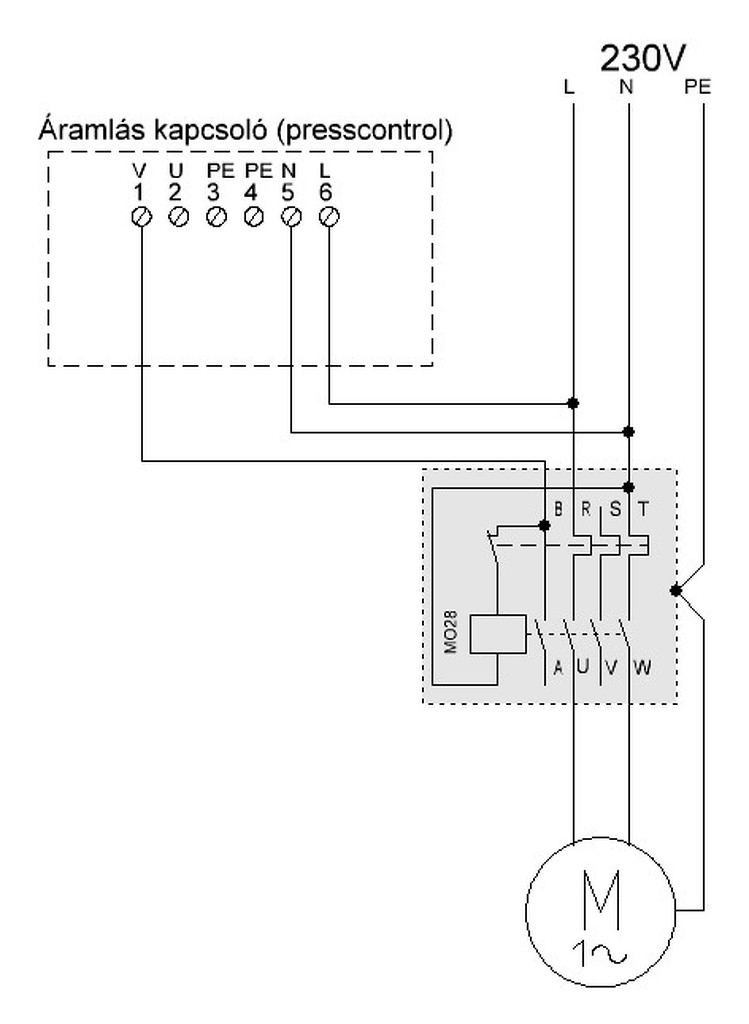 Van valaki aki tudna segíteni Ganz Mol28-as, olajos mágneskapcsoló bekötésében? Annyi a gondom, hogy eddig egy régi hidrofolt vezérelt. Két vezeték jött le a nyomáskapcsolóhoz. Erre szeretnék bekötni egy áramlás érzékelőt. Ez vezérelné a relét, ami indítja a szivattyút. Arra gondoltam, hogy a Motor "V" vagy "U" pontjára kötném azt az egy vezetéket, amire a régi nyomáskapcsoló adta a feszültséget. Csak azt nem tudom, melyiken jelenik meg az áram. Kép 1