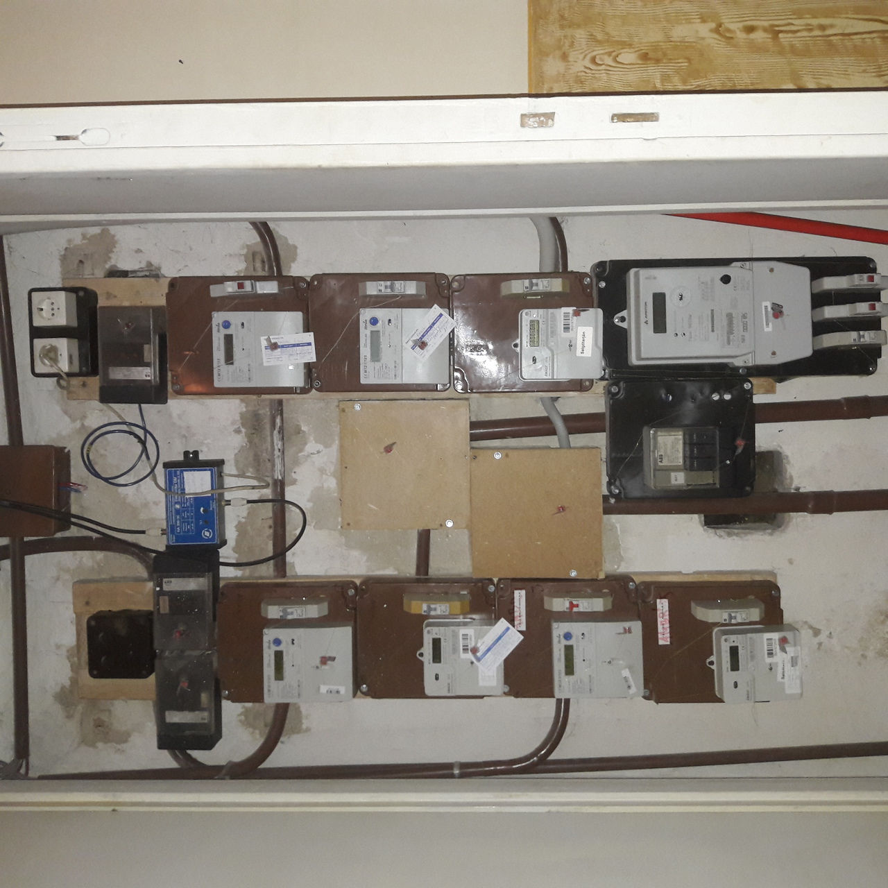 Én is laktam társasházban, az valamikor a 60-as években készült. Ott is csak a fázis és a nulla volt a bejövőnél, helyileg nem volt védőföld. Van egy belvárosi szintén régi építésű házban lakásom, ott sincs csak egy kék és egy fekete, pedig az már egy részleges felújításon is átesett. Ezeket a házakat akkoriban talán még társadalmi munkában is építették (tanulók, rendvédelmisek meg éppen aki arra járt), azon sem kell csodálkozni ha a kábel 45 fokban keresztben megy a falban. Mivel sok helyen olyan a lakás elrendezése hogy máshol nem lehet, a bejárati ajtó és az ablak felett a mennyezetben vitték át a falkábelt, plusz 1 centi vastag vakolatot ráhúzva.