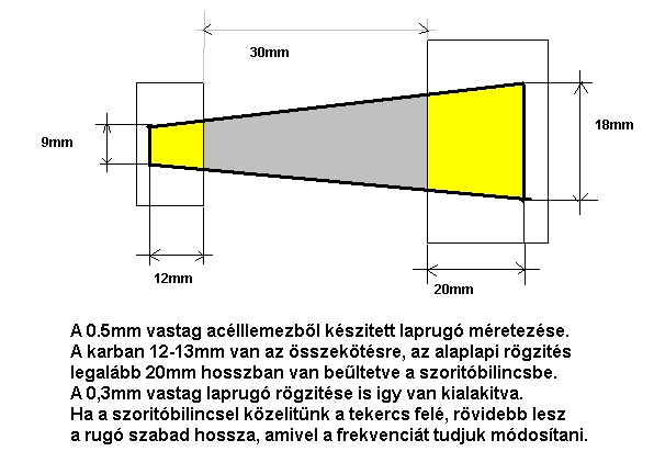 Leírom a rugólemezek beszerzési és méret adatait: 1. OBI, "gitteló lemezek" néven a festékes standon. (0.3 - 0.5mm vastag lemezek!). Ezeket lehet forrasztani is! 2. VasNagyKer, nyers acélszalagok, tekercsek. 40-50mm széles 0.3 - 0.5mm vastag csíkok, 1m-es darabokban (kérésre levágják méretre is!). Ezekről a helyekről beszerezhető a rugólemez mindegyik fajtája. 3. A beépithető lemez méretei 0.3mm vastag anyagból, egyoptós vezérléshez: 63mm magas, 28mm alul, 15mm felül, nyújtott trapéz alakban.(14-18Hz-re). 0.5mm vastag rugóacélból, H-hidas vezérléshez: 18mm alul, 63mm magas, 9mm felül, (18-24Hz-re). Szia.