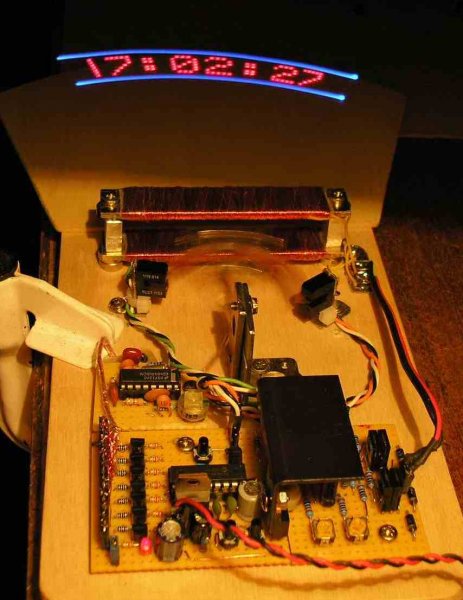 Itt van néhány kép az egyoptós önrezgő kapcsolással működő óráról. (Ebben szoktam kipróbálni a H-hidas vezérlést is nagy kijelzővel). Most "eredetiben" működik, 145mm karhossz + rugólemez, (0.5mm vastag), a kijelző SMD 1206 méretkódú LED-ekkel szerelt, 1 raszterre egymástól. Igy most 18Hz-en "ketyeg". Szia.