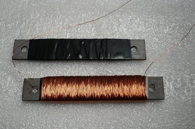 En meg ott tartok hogy van vasmag, (folytotekercs volt) 9.5 cm hosszu, 1.5 cm szelles, es negy darabot fogtam ossze belole. 7cm lett a tekercs hossz. Az egyik tekercs mar kesz. 20mH es pontosan 9 Ohm lett. Ha a ket tekercs sorba kotodik, akkor 2x9=18 Ohm -nal, 5 V-al max 270 mA fog folyni. Elsore mindenkeppen egy kissebb verziot fogok epiteni, es megprobalom orarugoval. Mindenkepp ket opto-val. Ha sikerul a ket optos elkepzelesem, akkor az egeszet majd lehet alkalmazni "barmekkora" lengokarnal. De ez meg a jovo zeneje... A tekercs igy nez ki: Udv.