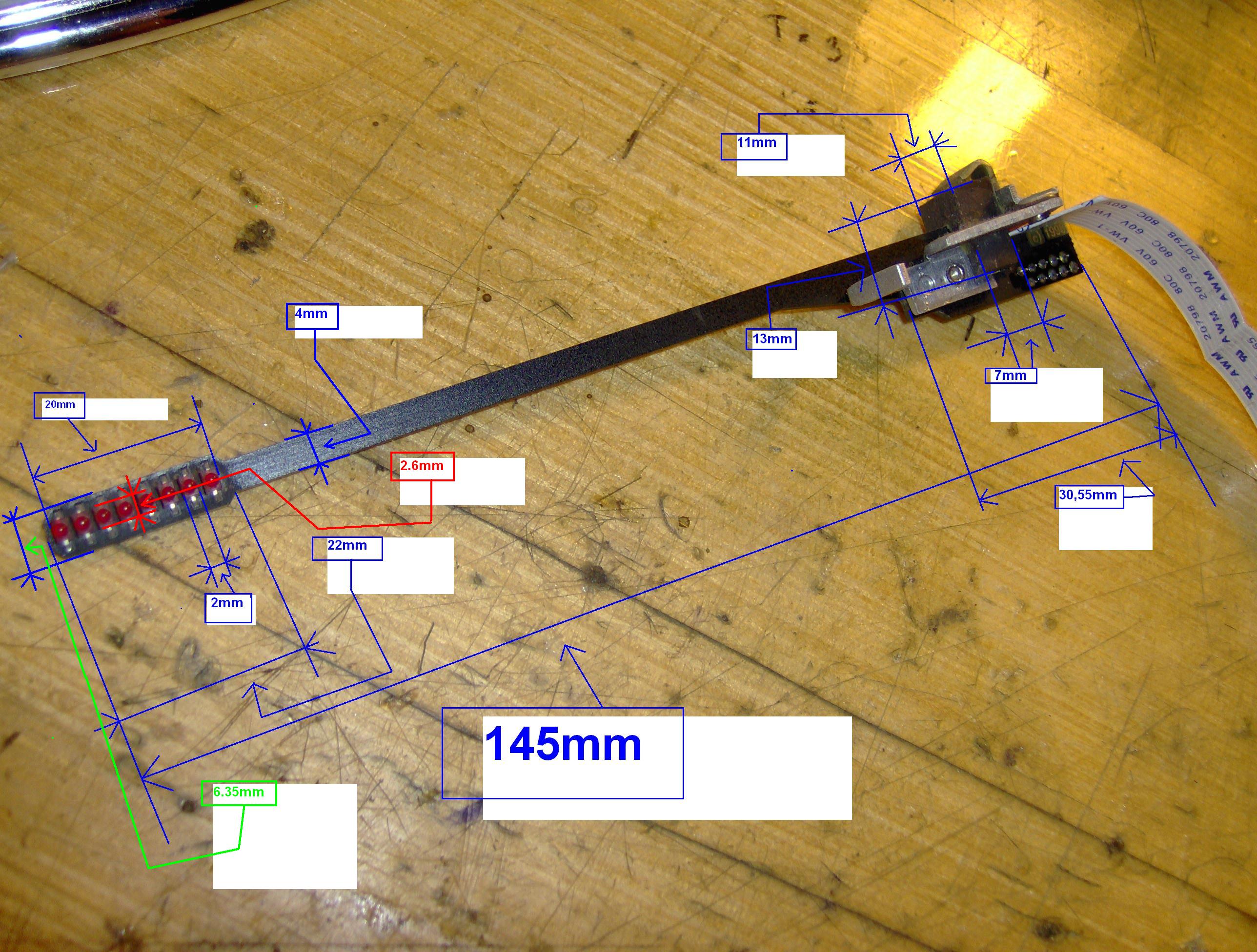 Gratulálok!!! Gondolom "élőben " nem vibrál.A kar közepénél az az érzékelő mi: mechanikus vagy opto.Rövid a kar útja azért nem látszik a vége?Lassan nekem is kellene egy karhossz, és a ledek távolsága.